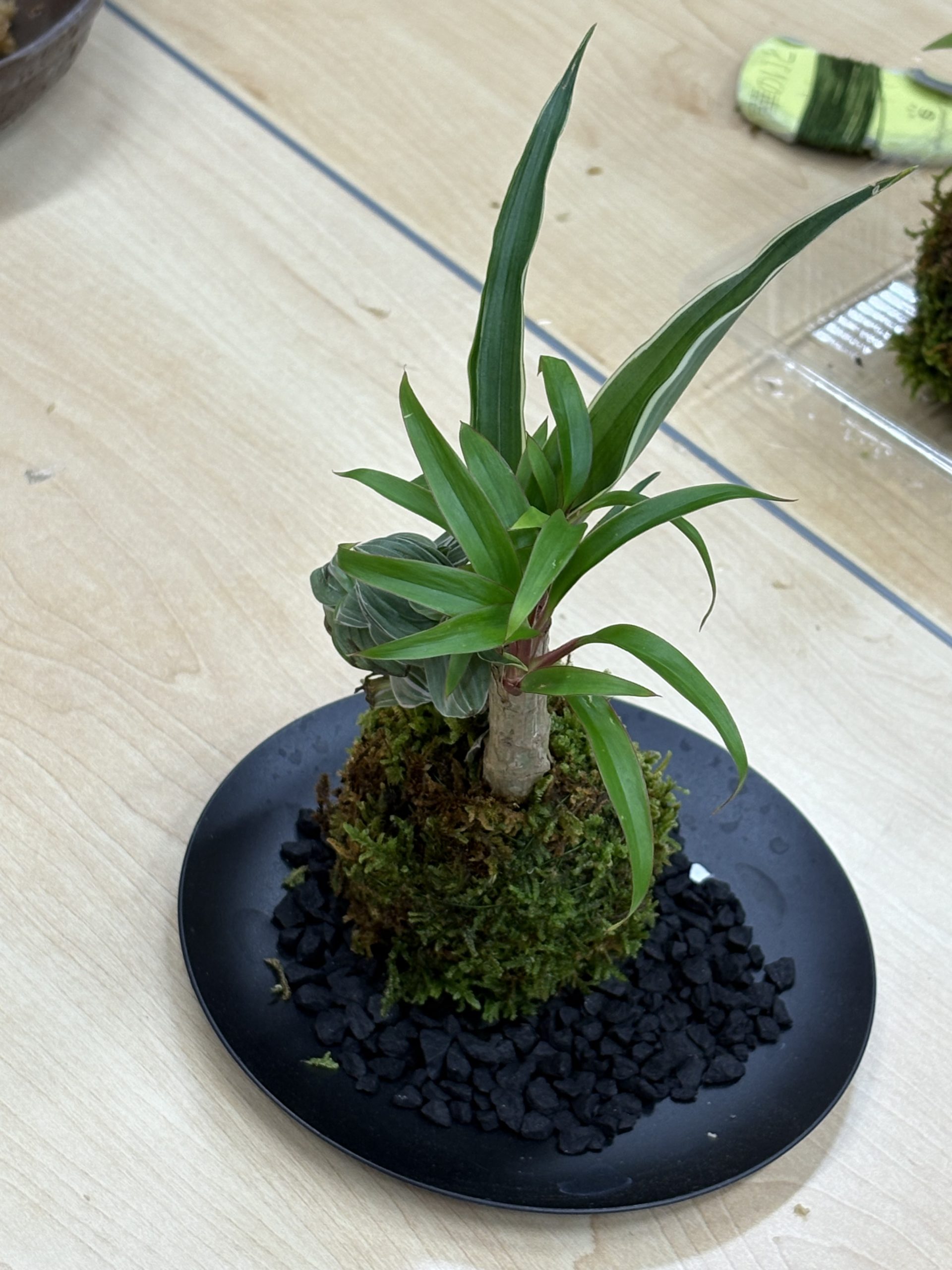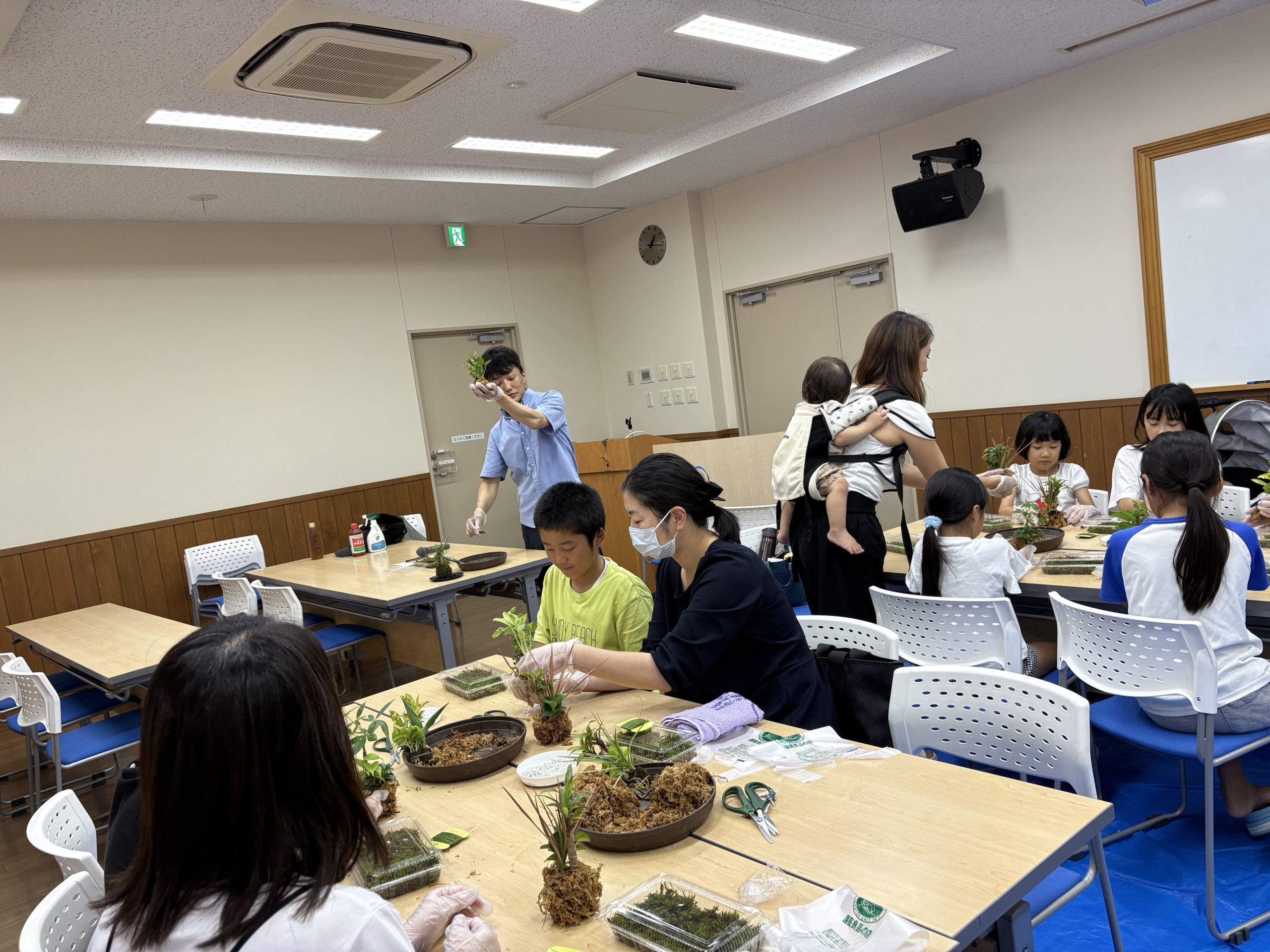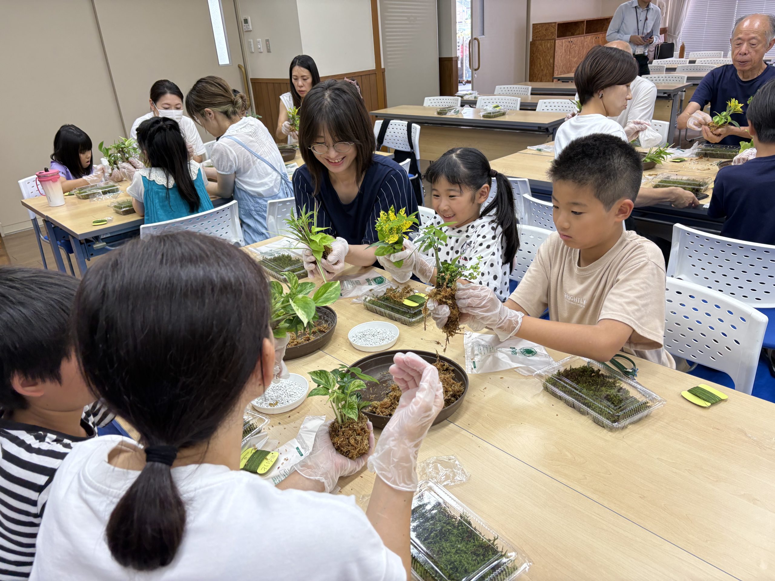 夏休みに親子で植物の大切さと育てて方を学んでもらえるように、猛暑の中ですが少しでも涼しさを感じれるように今年は「苔玉づくり体験」を開催しました。皆さんまるめるところで苦戦していましたが、可愛らしいそれぞれの苔玉ができました。